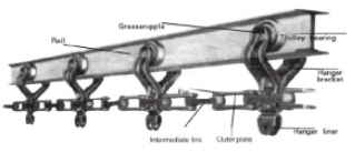 滑架的作用是承受物件,吊具及鏈條的重量,仔垂直彎曲段還要承受鏈條張緊的合力,并能保證鏈條按軸道的線路運行。在線路中兩個負載滑架之間距離超過800-900mm時,可在中間增加一個空載滑架?;芟盗兄饕╔348型, X458型, X678型, CC100型, X160型 。