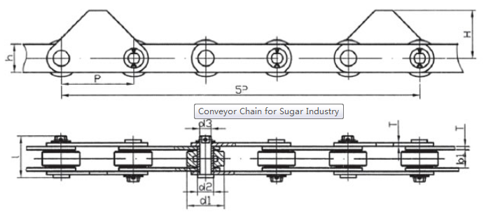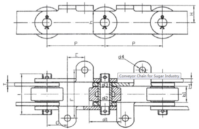 | Chain no. | Pitch P (mm) | Inner width of inner link b1 (min.) (mm) | Diameter of pin d3 (mm) | Diameter of roller d1 (min.) (mm) | Height of outer sidebar h1 (mm) | Height of inner sidebar h2 (mm) | Thickness of sidebar T (mm) | Length of pin L (mm) | Hole distance of attached plate f (mm) | Hole diameter of attached plate d4(mm) | Tensile strength (KN) |