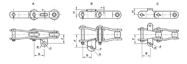 | Matching chain no. | H (mm) | T (mm) | B (mm) | F (mm) | R (mm) | D (mm) | Attachment type |